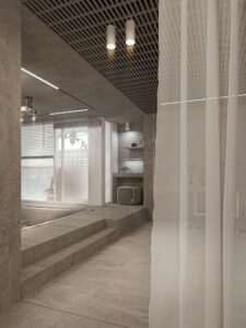سایر بخشها با پارتیشنهای سبک و کفسازی متفاوت از یکدیگر جدا میشوند تا حرکت سیال و پیوستگی میان فضاها حفظ شود.