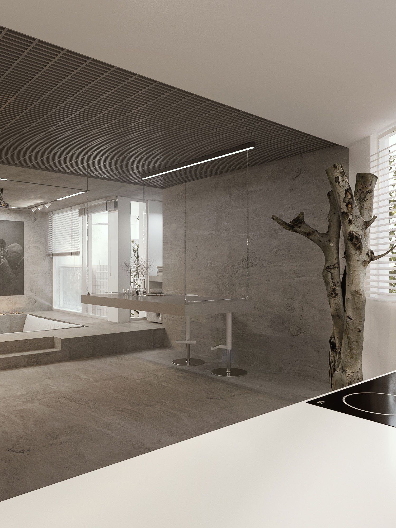 در این خانه، فضای نشیمن متناسب با نیازها و سبک زندگی کاربر، منعطف و بدون مبلمان طراحی شده تا محیطی مناسب برای تماشای فیلم، مطالعه، کار و دورهمیها فراهم شود. برای لحظات استراحت و آرامش، جکوزی و آب در تراس تعبیه شدهاند.