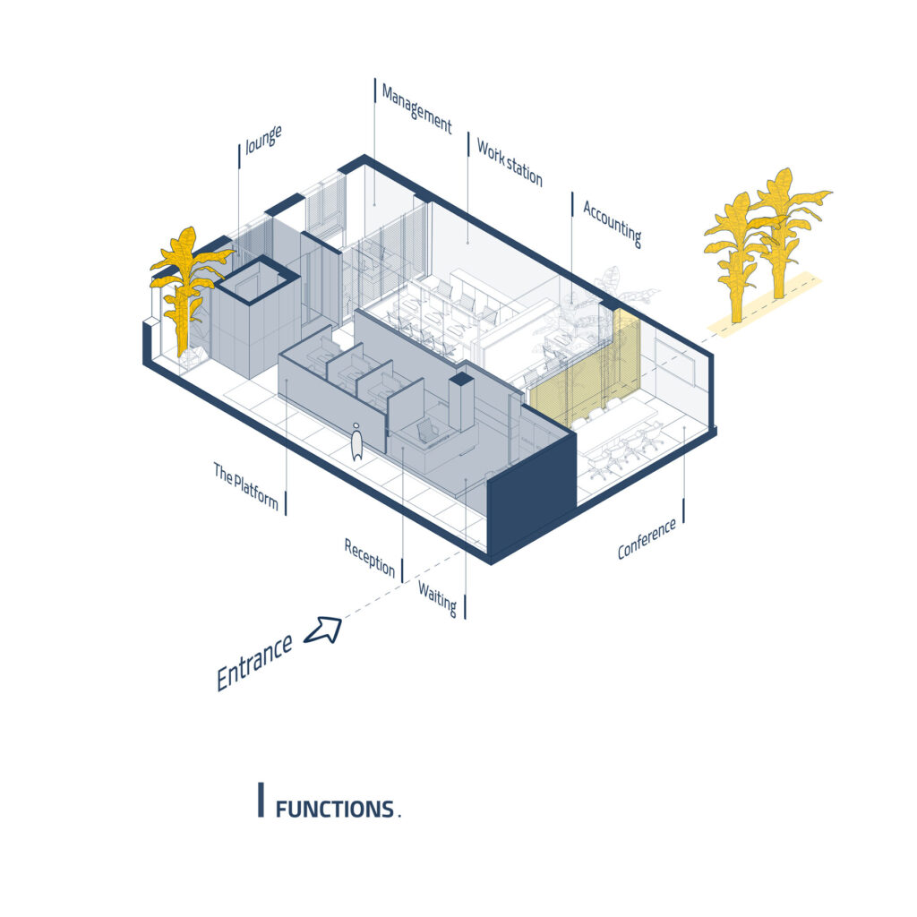 با پیشبرد برنامه پروژه سعی در خالی نگه داشتن مرکز پلان از عملکردهای عمومی یک پروژه اداری با کاربری واحد مالی و صرافی شد.