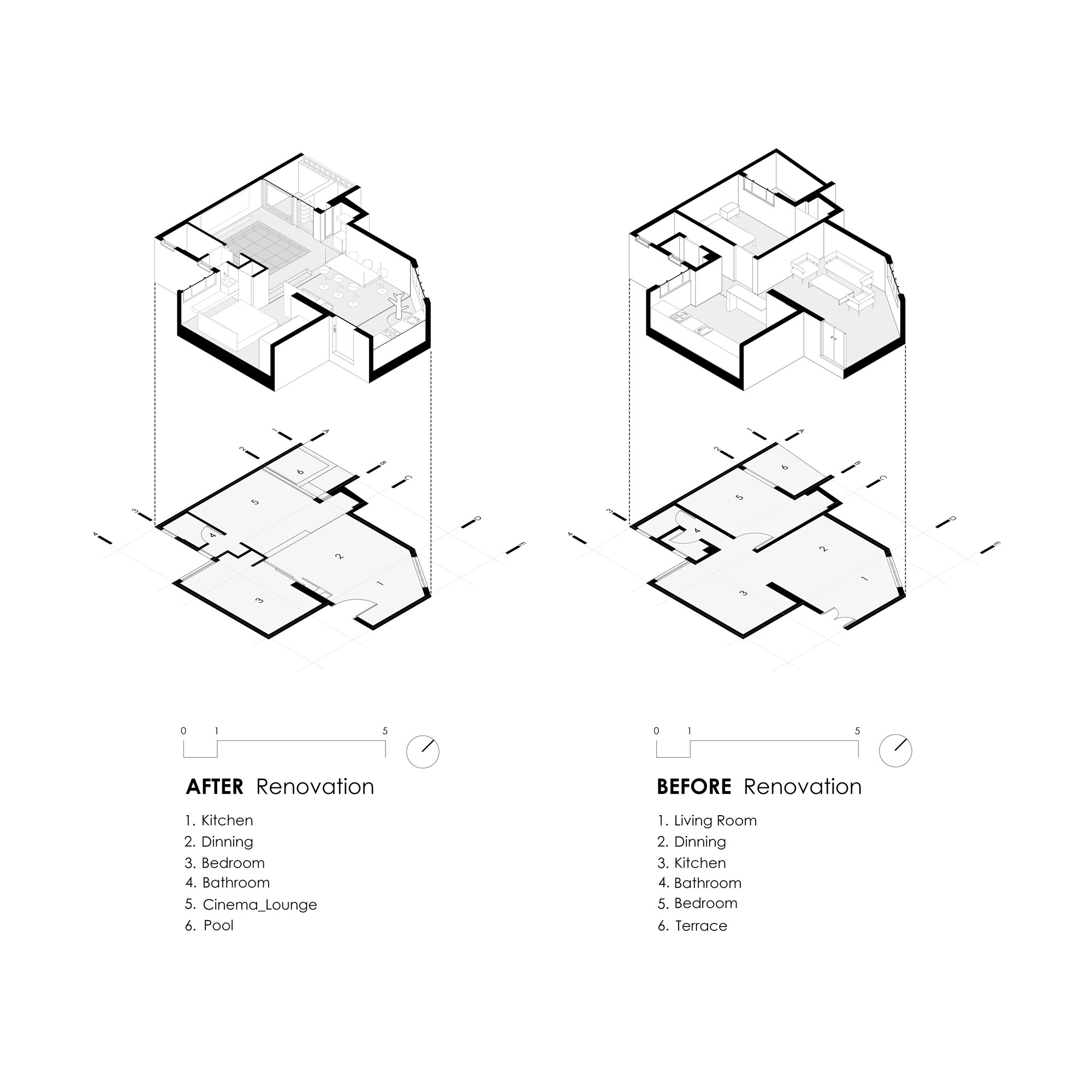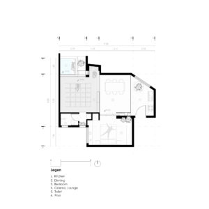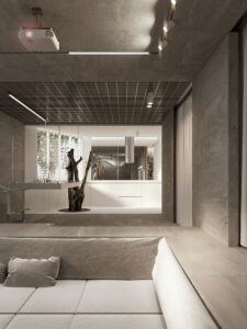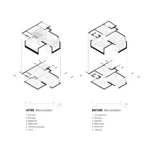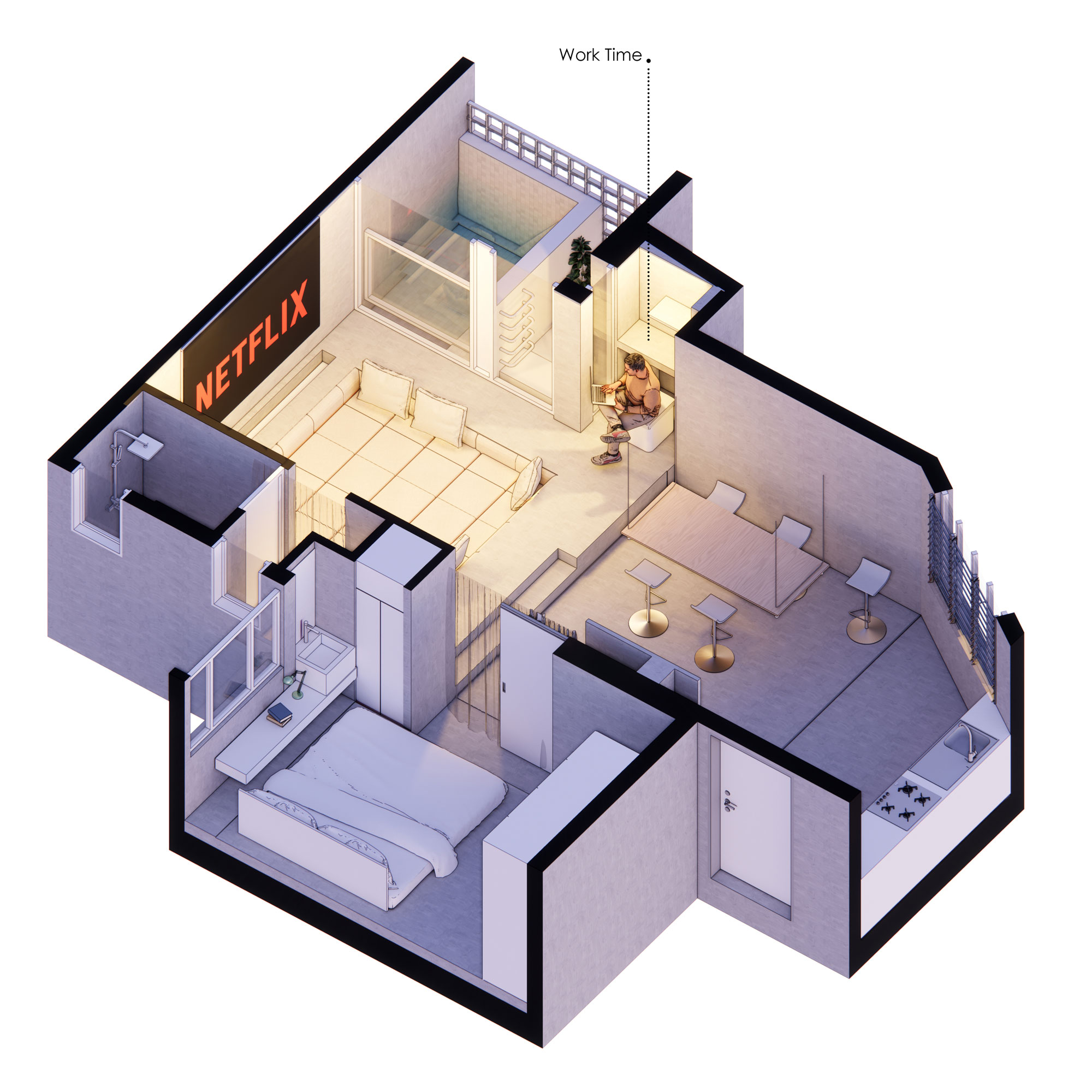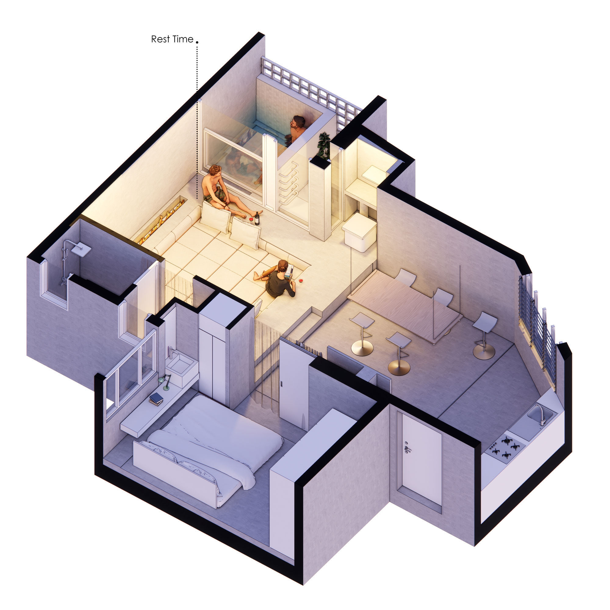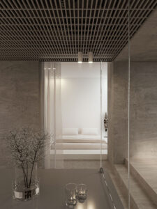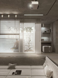 The living area is designed as a flexible, furniture-free space, adaptable to the user’s lifestyle—whether for watching movies, reading, working, or social gatherings. For moments of relaxation, a jacuzzi and water feature are placed on the terrace, creating a private retreat within the city.