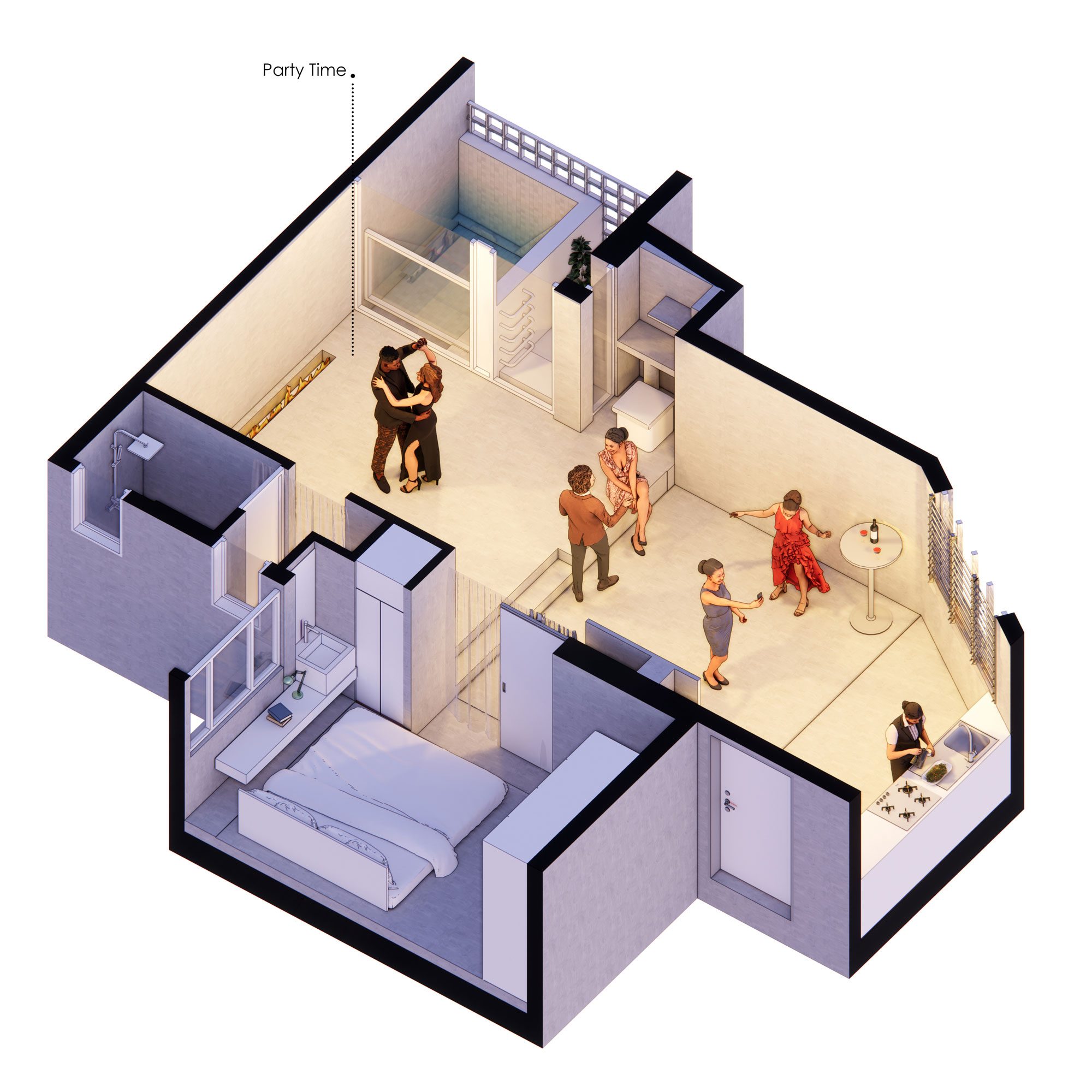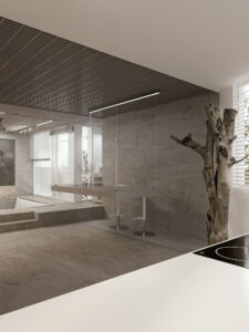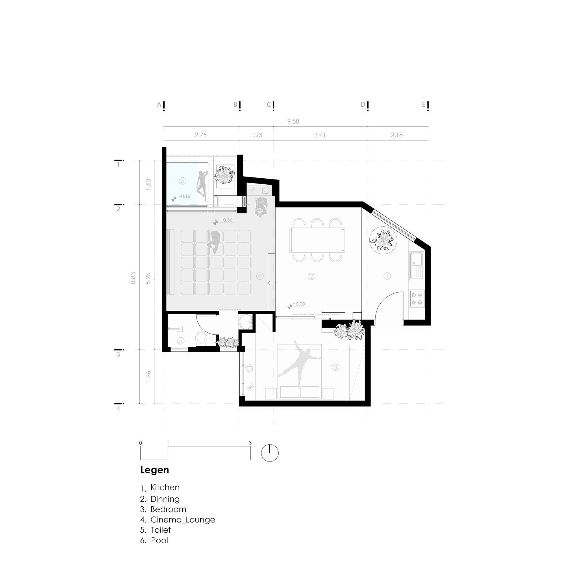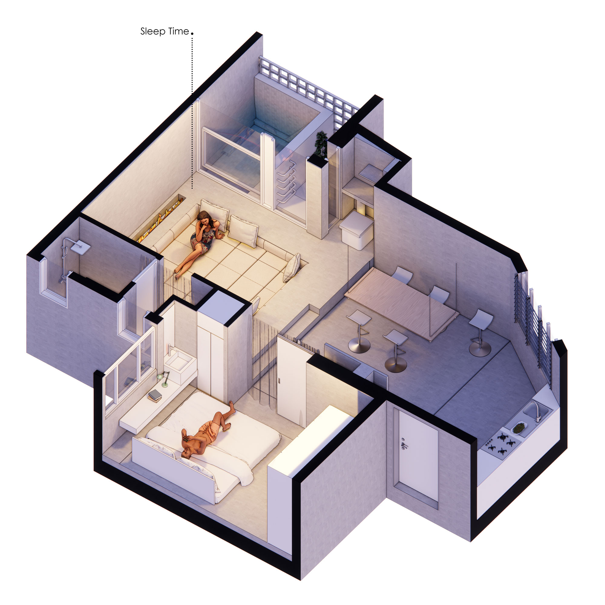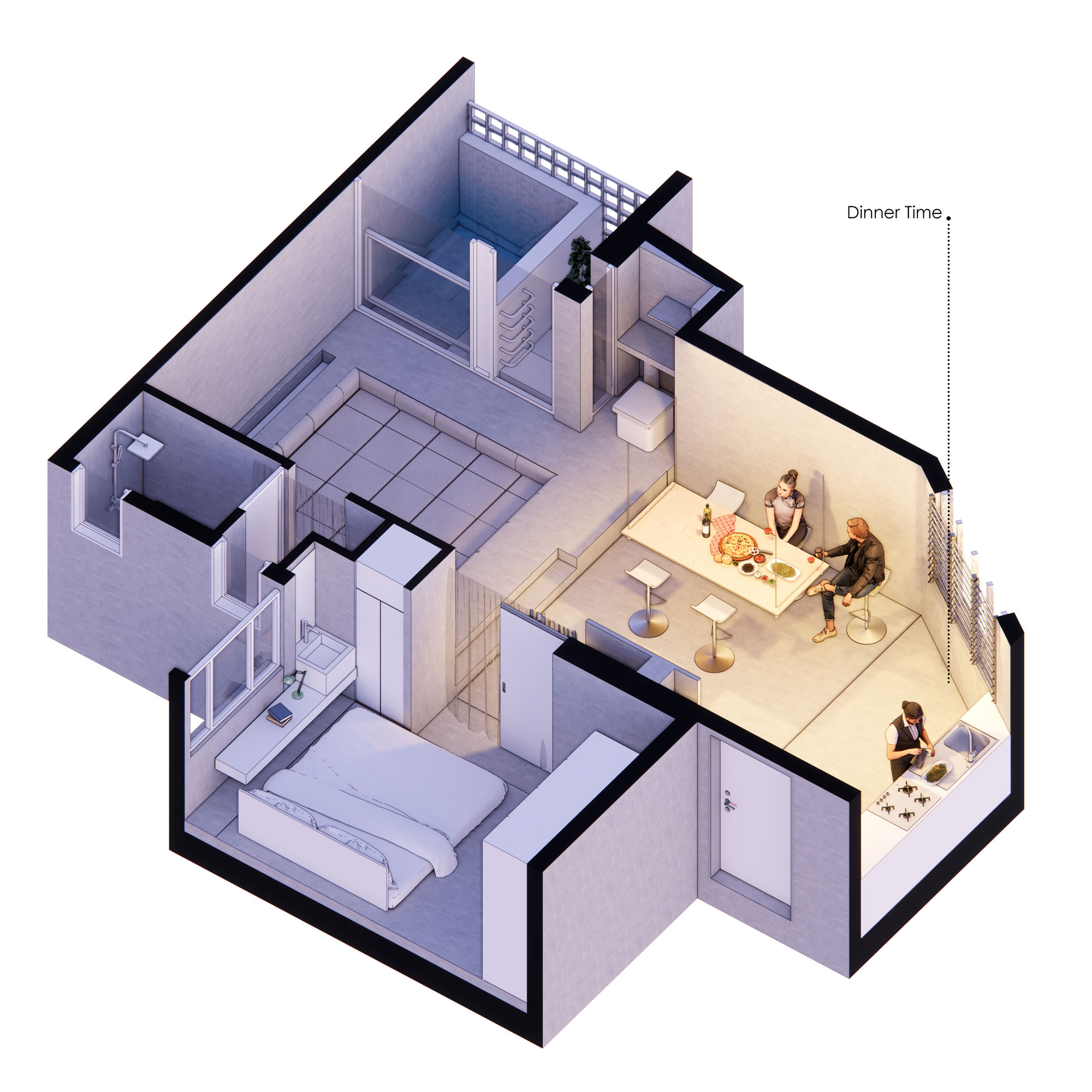 The living area is designed as a flexible, furniture-free space, adaptable to the user’s lifestyle—whether for watching movies, reading, working, or social gatherings. For moments of relaxation, a jacuzzi and water feature are placed on the terrace, creating a private retreat within the city.